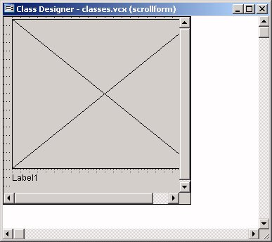 The first step is to create a separate form class to represent the scrolling region. Go to the Visual FoxPro class designer, and create a new class based on a form class. We'll call the class ScrollForm. Set its TitleBar to 0, its ScrollBars to 3, and its BorderStyle to either 0 or 1 (1 if you want the scrolling region to have a border, 0 otherwise).
