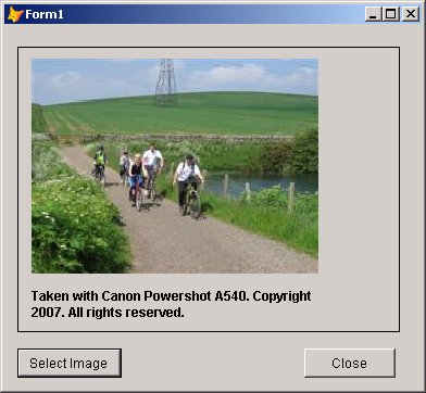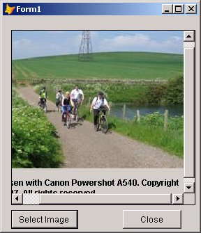 Finally, you need to populate the scrolling region with useful information. In this example, the scroller contains an image and a label. So add a button to the main form, and write code in its Click event to add a picture and some text to these controls. In practice, you might prompt the user for the picture's filename and location, and display some of the picture's property information in the caption of the label. To keep things simple, we'll hard-code that information here: